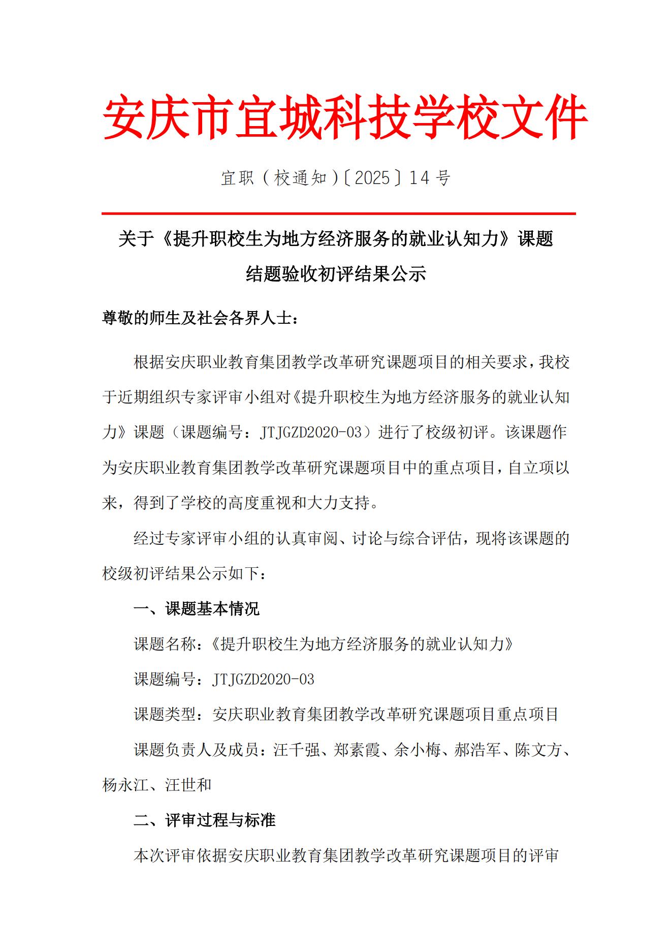 關于《提升職校生為地方經(jīng)濟服務的就業(yè)認知力》課題結(jié)題驗收初評結(jié)果公示